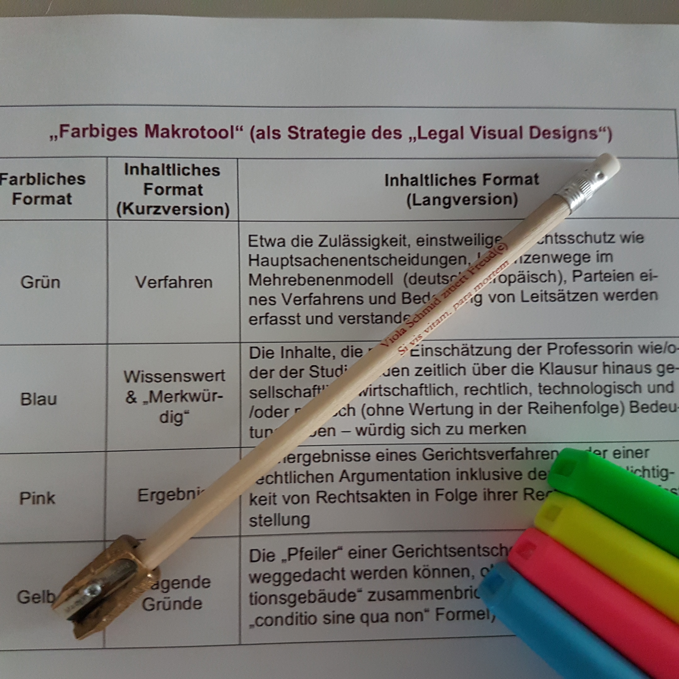 Das "Bühnenbild" beruft sich auf ein didaktisches Tool – das sog. Legal Visual Design (LVD). So werden wegweisende Gerichtsentscheidungen, die teilweise über 100 Seiten Text umfassen, für die Studierenden analysier- und strukturierbar. Weitere Informationen zur Prüfung der auch "Realtime-" Lehrinhalte: